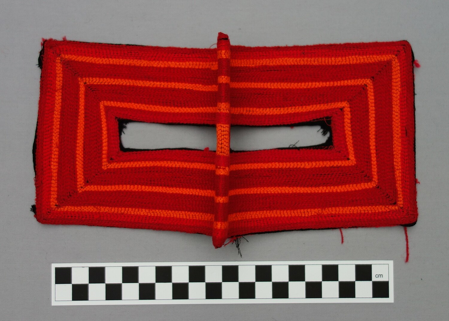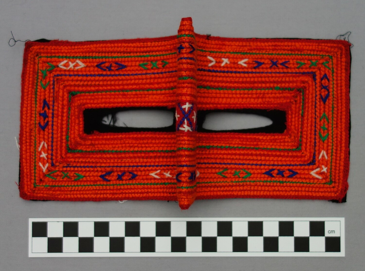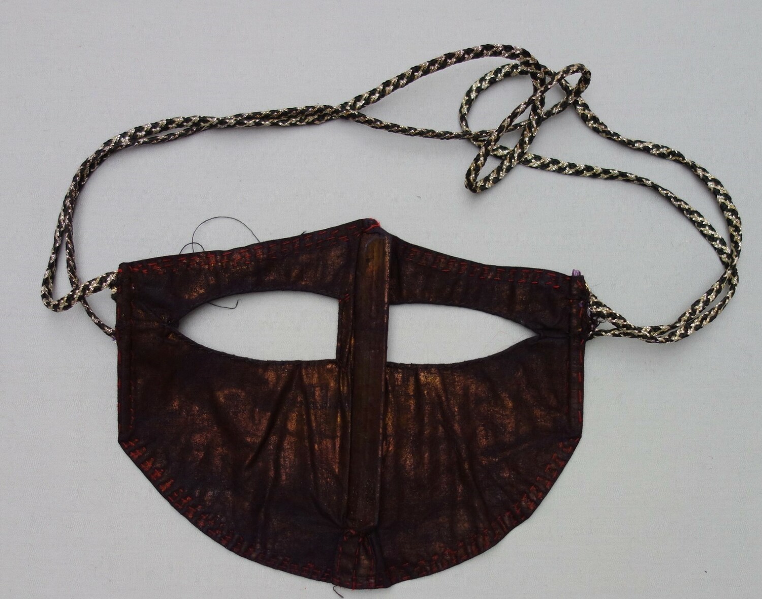 Perhaps one of the most widely known aspects of Bandar dress are the various types of face coverings. The type of face veil worn by a Bandar woman depends in the main on three factors, namely (a) her religious background (Sunni or Shi`ite), (b) her ethnic origins, and (c) where she lives. Many Shi`ite women in the Bandar region, for example, wear bright red, rectangular masks of the battulah construction that only covers the part of the face around the eyes, locally known as a burqa`, and decorated with various patterns. Originally these were hand worked, but nowadays most are decorated using machine embroidery. The colour and designs provide information as to which ethnic group the wearer derives from. Sunni women of Arab origin in the Bandar region sometimes wear a type of battulah. The main form of battulah that they use is squarish and rather long in shape. It is made out of black cotton or black velvet, or cotton cloth smeared with indigo and then polished until it adopts a golden hue. This golden coloured type of (Sunni) veil is similar to that worn in parts of Qatar, on the other side of the Persian Gulf.