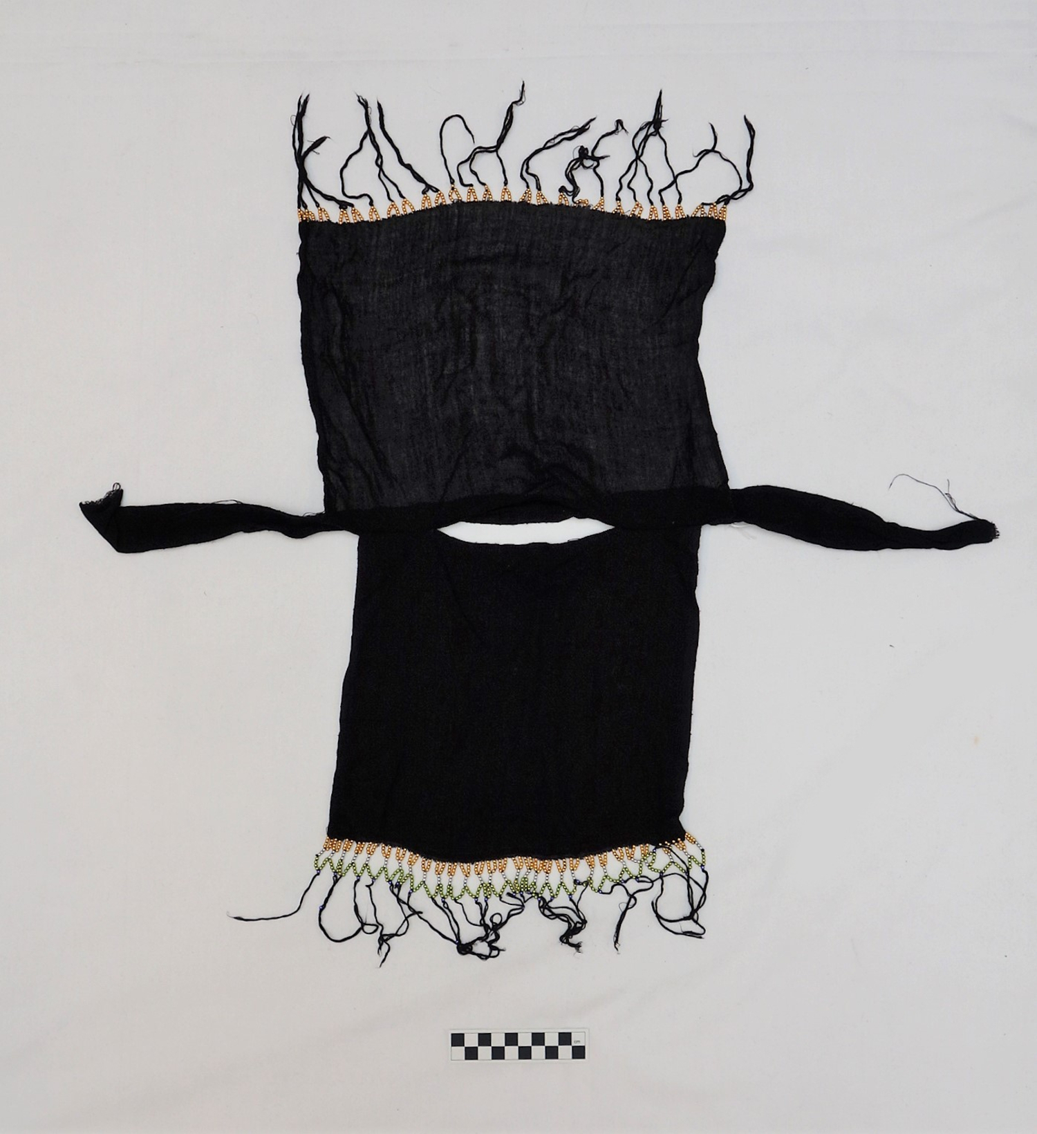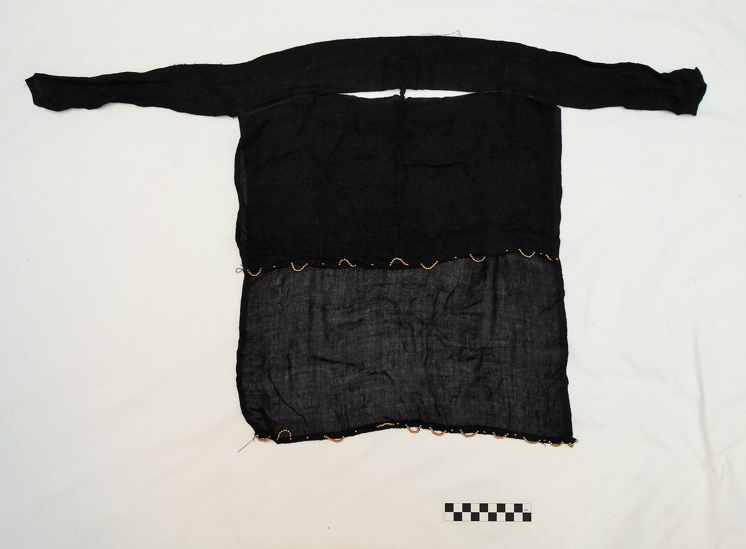 The basic garment worn over the trousers is a dress (kondura). The older style dresses are made in coloured cotton, which are either waisted (gavan style) or cut full (dara'a). The head covering is normally made up of a rectangular (c. 70 x 100 cm) scarf of thin black material (makna). Over all these garments, women generally wear a large, semi-circular chador, which is made from a very light weight cotton.