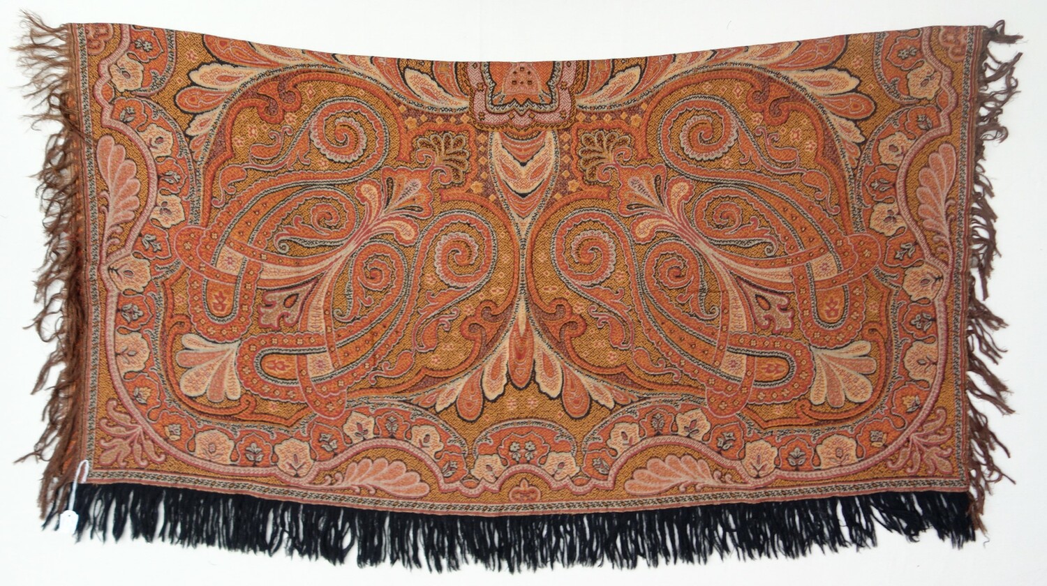 Detail of a woven Kashmir-style shawl, produced in Europe, mid-19th century (TRC 2019.2029).The high demand for these fashion accessories/fabrics resulted in other forms of the mass-produced shawls being developed, such as embroidered versions (a development that also occurred in Kashmir) and very cheap examples that were printed. Mass production globally popularized the buteh under the name of ‘paisley’. As a result, for most people in the West, and indeed elsewhere, it has remained the paisley motif.