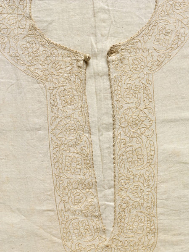 The smock is embroidered in chain stitch with unbleached silk thread, and the seams are backstitched with silk. The designs are reminiscent of Indian examples, such as various palmate motifs and the lotus, but the linen fabric is European, and so is the T-shape of the garment.