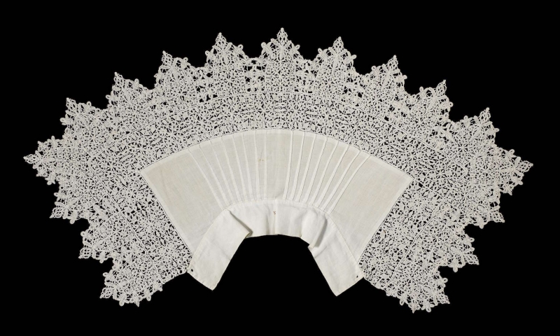 The Rijksmuseum in Amsterdam houses a remarkable lace collar. It dates to about the second quarter of the seventeenth century. It was sewn in The Netherlands, but the lace itself was probably made in Italy. The collar consists of a linen main piece offset with a large panel of lace. The lace attached to the linen main piece is worked in reticella with square shaped motifs. The scalloped edge is worked in punto in aria.