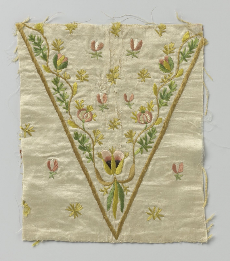 The collection of the Rijksmuseum in Amsterdam includes a fragment of white silk with polychrome floral embroidery. It dates to c. 1680 and probably was made in Holland. It measures 21.7 x 18.2 cm. The V-shape may indicate its use as a stomacher.