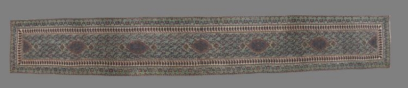 The floor cover was acquired in Afghanistan by Major John Goodday Strutt Gilland (1791-1848), who served with the Second Queen's Royal Regiment in the First Anglo-Afghan War (1838-1842) and who played a prominent role at the siege of Ghazni in the summer of 1839 (the town was taken by the British on 23 July 1839). The cloth was allegedly made for Dost Muhammad Khan (1793-1863), ruler of Afghanistan and the father of Ghulam Haidar Khan, the governor of Ghazni at the time of the British siege.