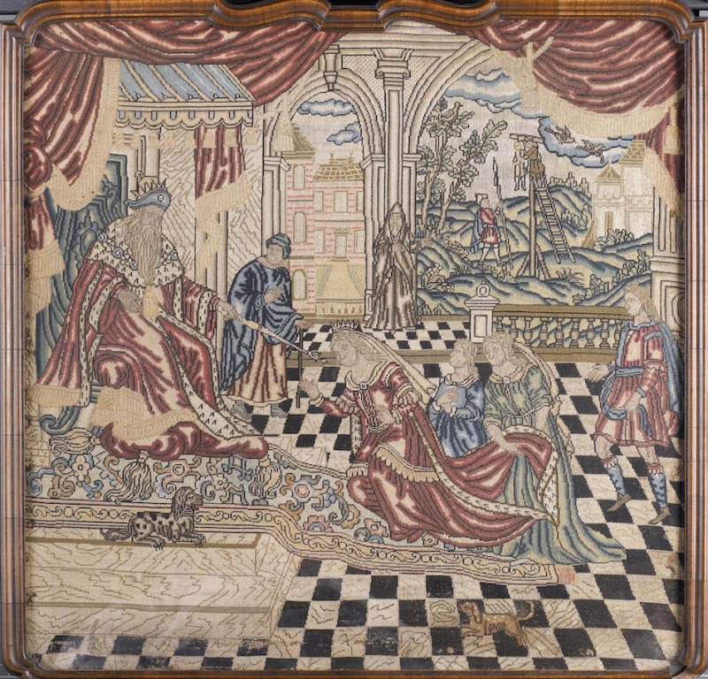 The National Museums Scotland houses an embroidered picture, probably originating from Italy and dating to the second half of the seventeenth century. It represents the (Apocryphal) Biblical story of the Persian King Ahasverus and (the Jewish) Queen Esther, and the Persian vizier, Hamam (Book of Esther 7). The embroidery is worked in coloured wools and silks on a linen ground.