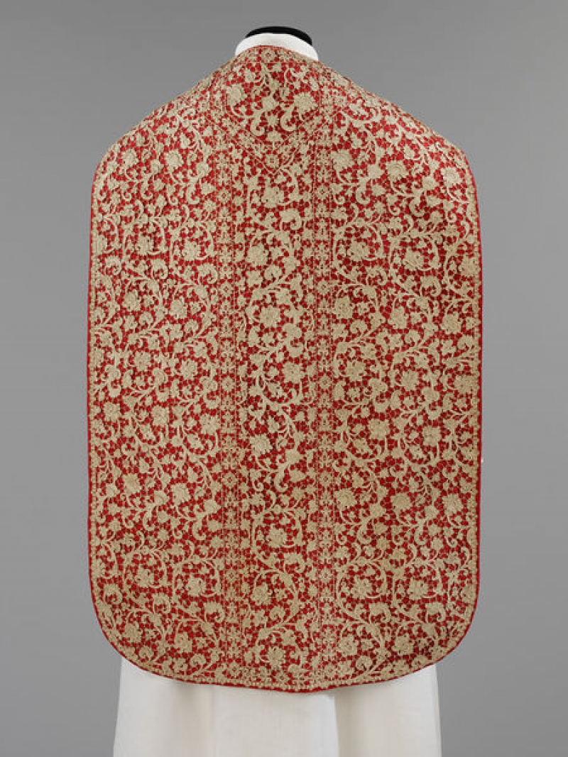 This type of lace was very fashionable in the mid- to late seventeenth century and would have been very expensive. The chasuble and accompanying chalice veil (acc. no. 746-1870), maniple (acc. no. 745-1870) and stole (acc. no. 744-1870) were purchased by the museum from the London lace dealers, A. Blackborne & Co., in 1870.