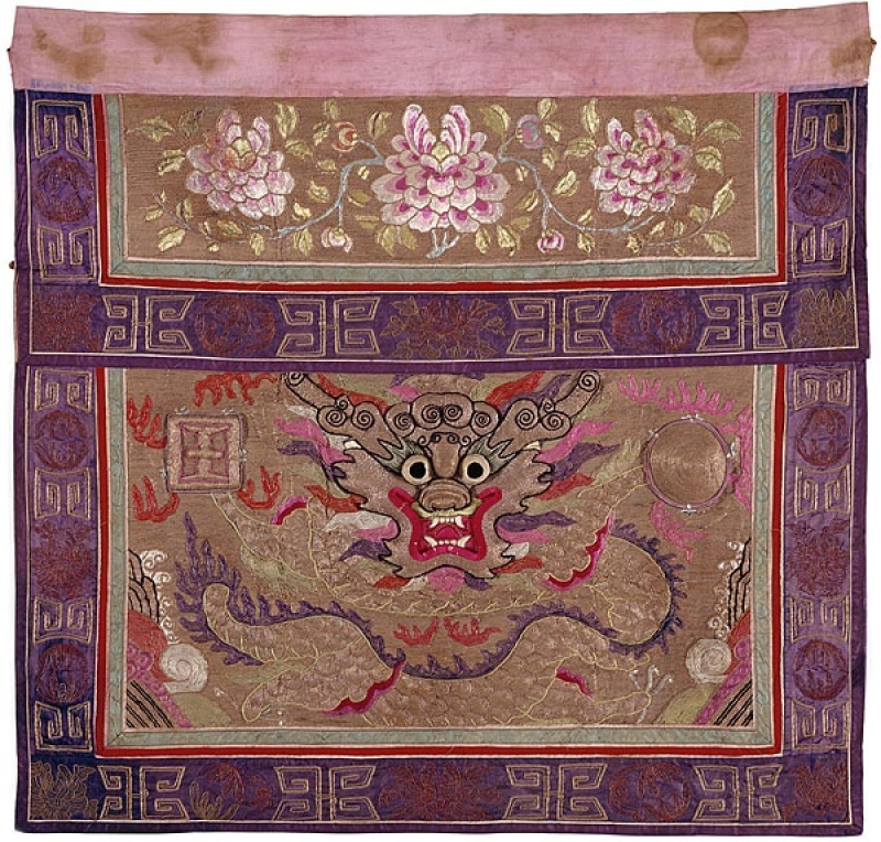 Altar frontals for auspicious occasions are usually embroidered on red silk cloths, often with designs of dragons, phoenixes and Buddhist lions; some have stellar gods of good fortune, prosperity and longevity. Those for funerals are generally in sombre colours, especially blue and violet, with cranes, deer, butterflies and floral motifs.