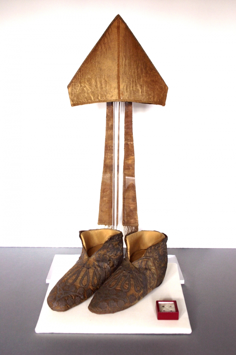 Some of the textiles were extremely fragmentary, and may have been part of the alb and dalmatic. Far better preserved were an apparel (for an amice); a pair of buskins (embroidered stockings); a stole; a mitre; a braid, and a pair of slippers, most of which were heavily embroidered.