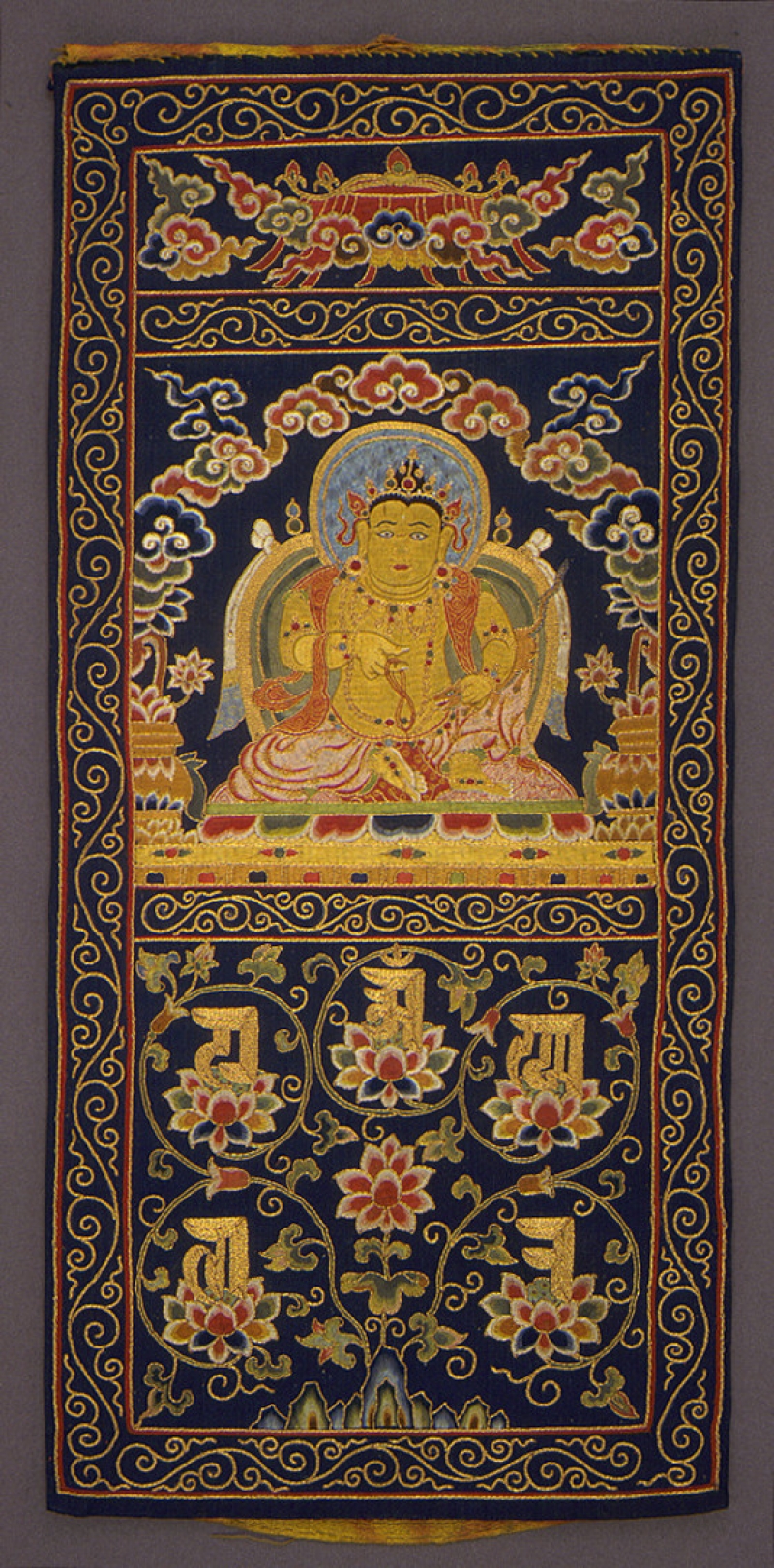 The Los Angeles County Museum of Art houses a votive panel from China, which dates to the early fifteenth century. It measures 40 x 18 cm. It is made of silk with silk and metal thread embroidery.