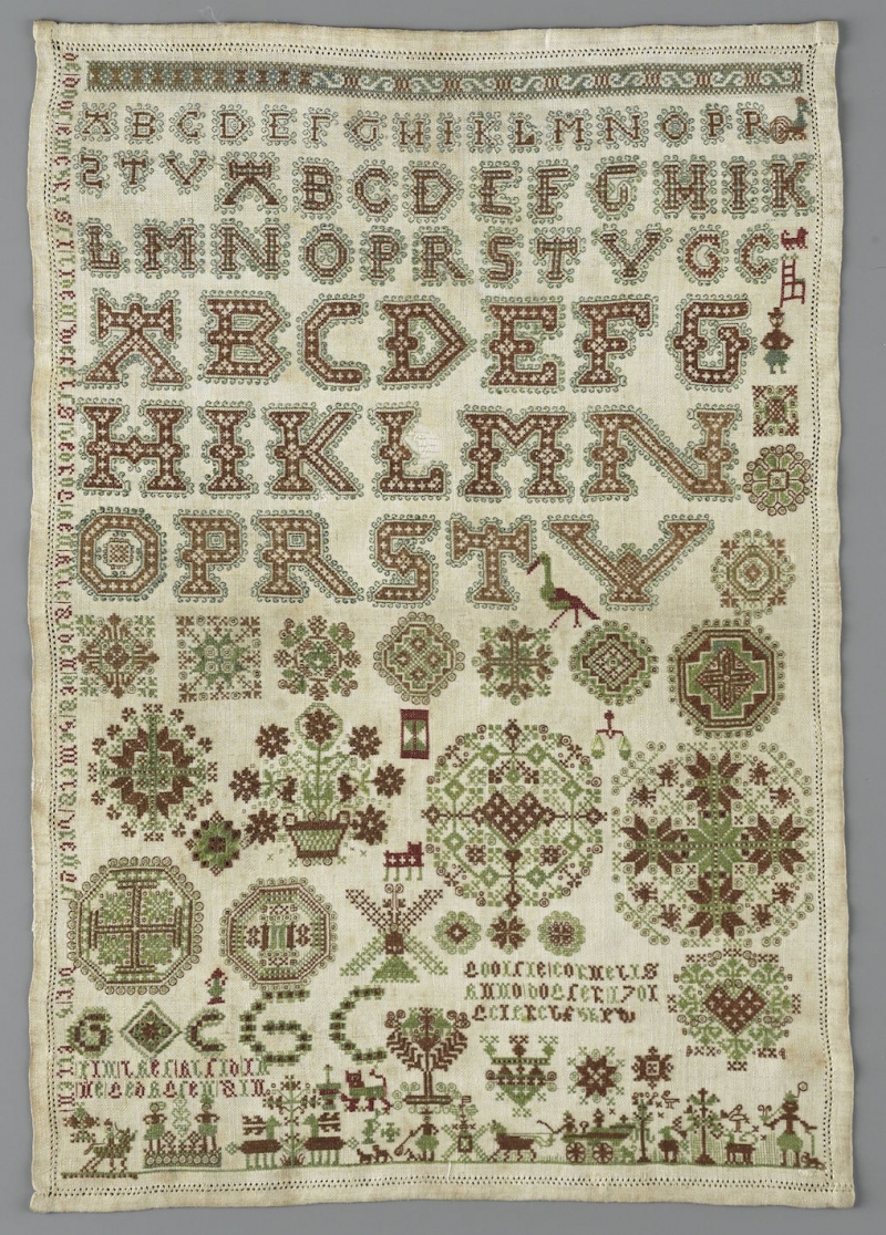 In the right hand bottom corner there is a man depicted smoking a pipe. He may be a bee-keeper. Characteristic features of samplers from this period are the octagons, the wide edges, the decorated letters, and the images taken from daily life, including the beekeeper, but also a horse-drawn carriage, a mill, etc.