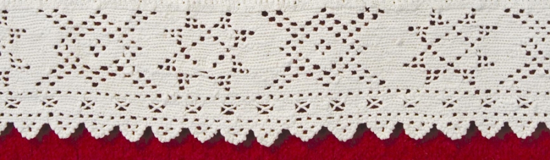 In the case of the older, eighteenth century Hedebo embroideries, the edges are modest in appearance and size. They were often used for the shirt collar and the linings of sleeve cuffs. From the early 1800’s, the Hedebo edges developed into richer designs, but still served only as decorative edging. In particular, it was used to decorate shift and shirt collars. Over time, these edgings developed into sumptuous expressions of the embroidery art, including motifs depicting flowers and geometric forms. More modest versions of this work can be found all over Denmark, but the more elaborate forms were only produced in the Hedebo area and in the northern part of Zealand.