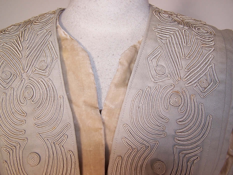 The use of soutache braids became popular in the West in the nineteenth century, for creating various types of interlacing designs and letters (especially for Celtic designs). A suitable design was worked in ink or paint on a ground material and then the braid was laid onto the design and stitched down the middle using a small running stitch. The aim was to complete the design using one continuous length of braid.