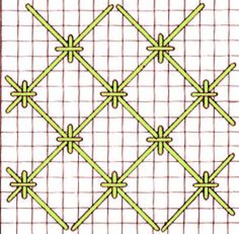 Jacobean couching is a composite stitch with a trellis appearance. It consists of long straight stitches, crossed by a second set of long stitches, creating a trellis work. The long stitches are subsequently fastened to the ground material by small cross stitches, often in a different colour. Jacobean couching is known as couched filling stitch, Jacobean laidwork or trellis couching.
