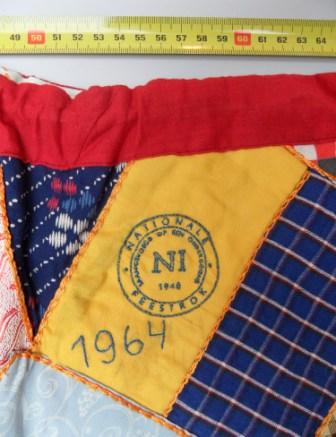 According to the registration card, Mrs. Slavekoorde was born on the 19th April 1915. The skirt was given the number 1964, and this number, as required, was stitched to the skirt itself (see the photograph to the right). As is required for a feestrok the garment is made out of numerous, colourful patches sewn together with orange thread. Along the front hem, as can be seen in the above photograph, is the inscription 5 mei 1945.